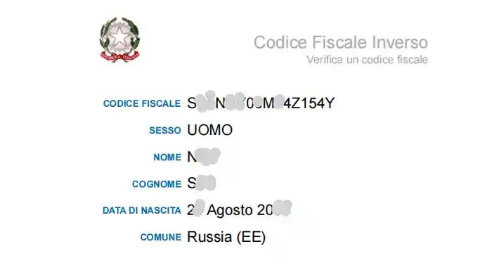 - «Codice Fiscale Inverso / Verifica» — сервис просто раскладывает введённый код на ФИО, дату рождения и страну рождения. Это не база налоговой. Он показывает «Russia (EE)», где EE = Estero — рождение за пределами Италии.
